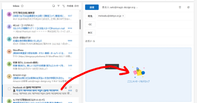 新規メールを開いて、迷惑メールを本文にドラッグ(私はココがわからなかった)して送信するだけ。